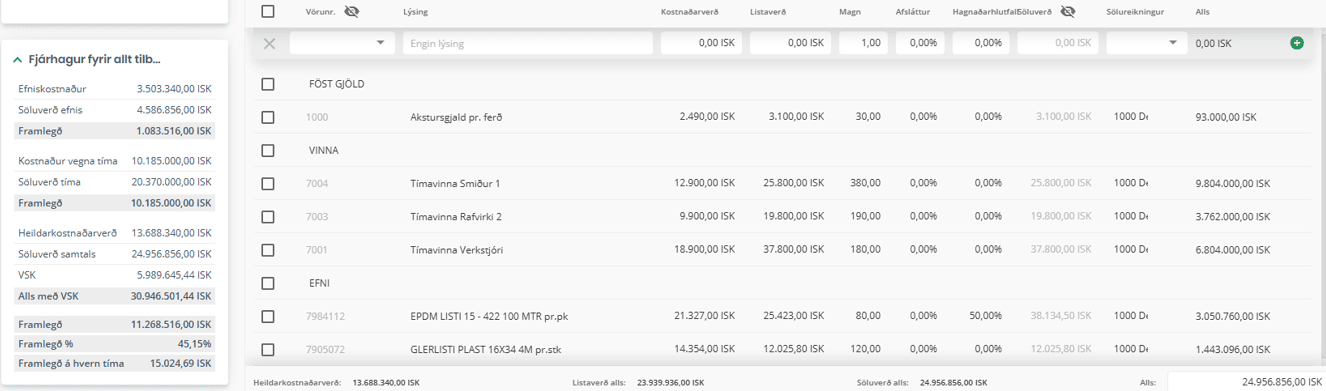 - Fullkomið verkfæri til tilboðsgerðar sem sýnir framlegð á verki jafnóðum og tilboð er sett saman.